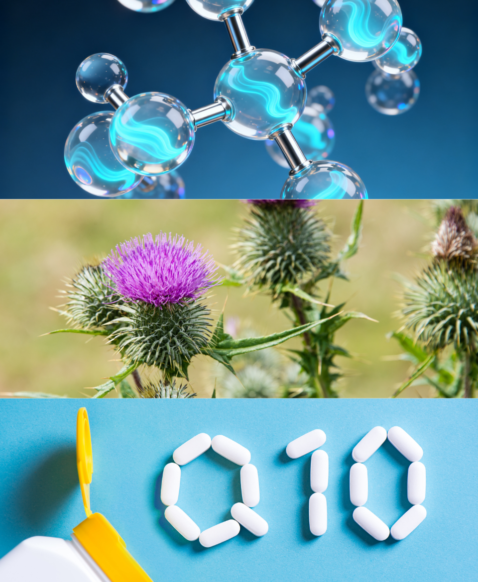 Coenzyme Q10 boosts mitochondrial function, enhancing energy, liver health, metabolism.